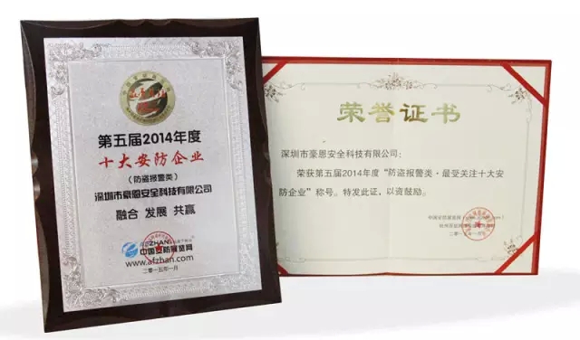 2015年3月16日,由中國(guó)安防展覽網(wǎng)主辦,備受業(yè)界關(guān)注的“第五屆2014年度最受關(guān)注十大安防企業(yè)頒獎(jiǎng)盛典暨2015年安防新技術(shù)創(chuàng)新及成果研討會(huì)”在杭州召開,豪恩安防獲得“最受關(guān)注防盜報(bào)警類十大安防企業(yè)”榮譽(yù)稱號(hào)。