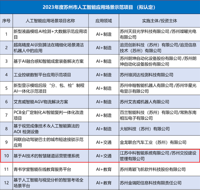 近日,2023年度蘇州市人工智能應用場景示范項目名單公布,中安科子公司中科智能與蘇州交投建設管理有限公司聯(lián)合申報的“基于AI技術的智慧隧道運營管理系統(tǒng)”通過評審,成功入選人工智能應用場景示范項目。