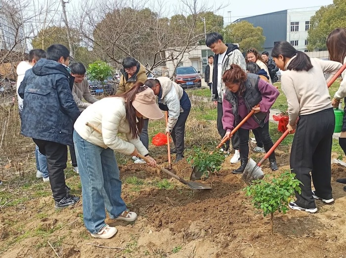 在植樹現(xiàn)場,大家干勁十足,分工協(xié)作,有的揮鍬鏟土、有的細心栽種、有的培土澆水……各個環(huán)節(jié)有條不紊,默契配合。